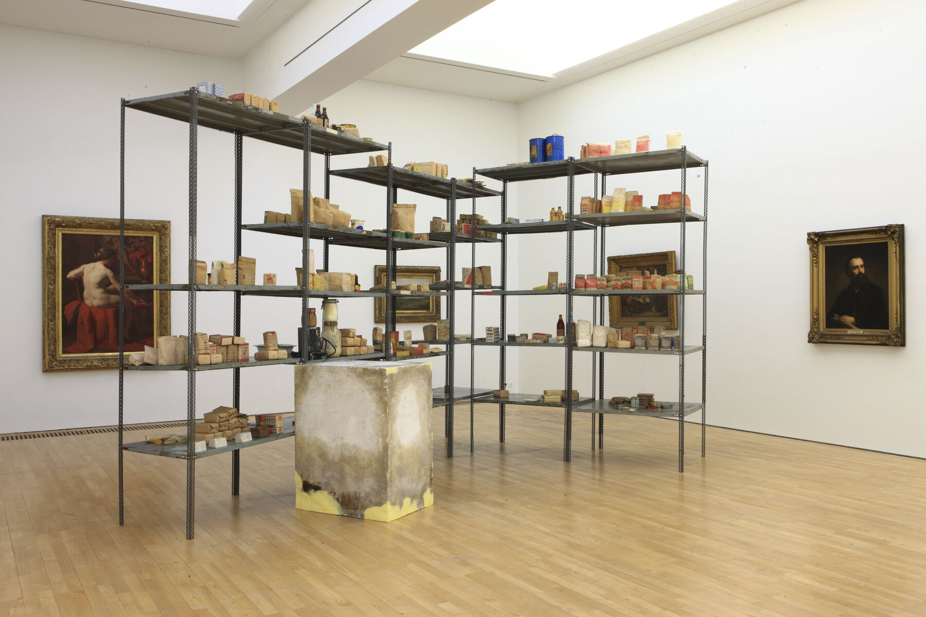 The components break down into four general categories. First, there are six metal racks. These were bought by the German publisher Gerhard Steidl at a pawnshop or metal dealer in Berlin (, 178).2 Since they were secondhand, the racks already showed wear in 1980. Positioned on the racks are a variety of packaged food items and other provisions: sugar, cookies, beer, rice, sulfur, honey, tea, barley, millet, salt, rabbit pâté, chocolate, bandages, batteries, and more. Beuys began collecting these packages from the former German Democratic Republic several years before the creation of Wirtschaftswerte. His friend, the graphic designer Klaus Staeck, had family in the GDR and regularly brought packages to West Germany for Beuys. While it is assumed that in 1980 there were about 510 packages in the installation, today there are only 462 packages. Every item shows the artist’s signature and the inscription “1 Wirtschaftswert” (fig. 17.2). The third element of the installation is a rectangular plaster block. This block had been in the artist’s studio since the 1960s and became part of a fixed work in 1980, specifically in front of the metal racks of Wirtschaftswerte (, 21). The corners of the block were intentionally damaged by the artist, and he used butter—a common product in his oeuvre—to restore the rectangular shape (fig. 17.3). On the top of the block, Beuys has written “Der Eurasier läßt schön Grüßen. Joseph” (The Eurasier sends kind greetings). While the butter is removed at the end of each exhibition, it has penetrated the plaster over the years, giving the work quite a specific aroma. And last but not least, wherever Wirtschaftswerte is displayed, several paintings are shown alongside it. There are no specific paintings that belong to the installation; the subject matter may vary, but, per a S.M.A.K. condition report from 1999, the paintings must date from between 1818 and 1883, the life span of Karl Marx.