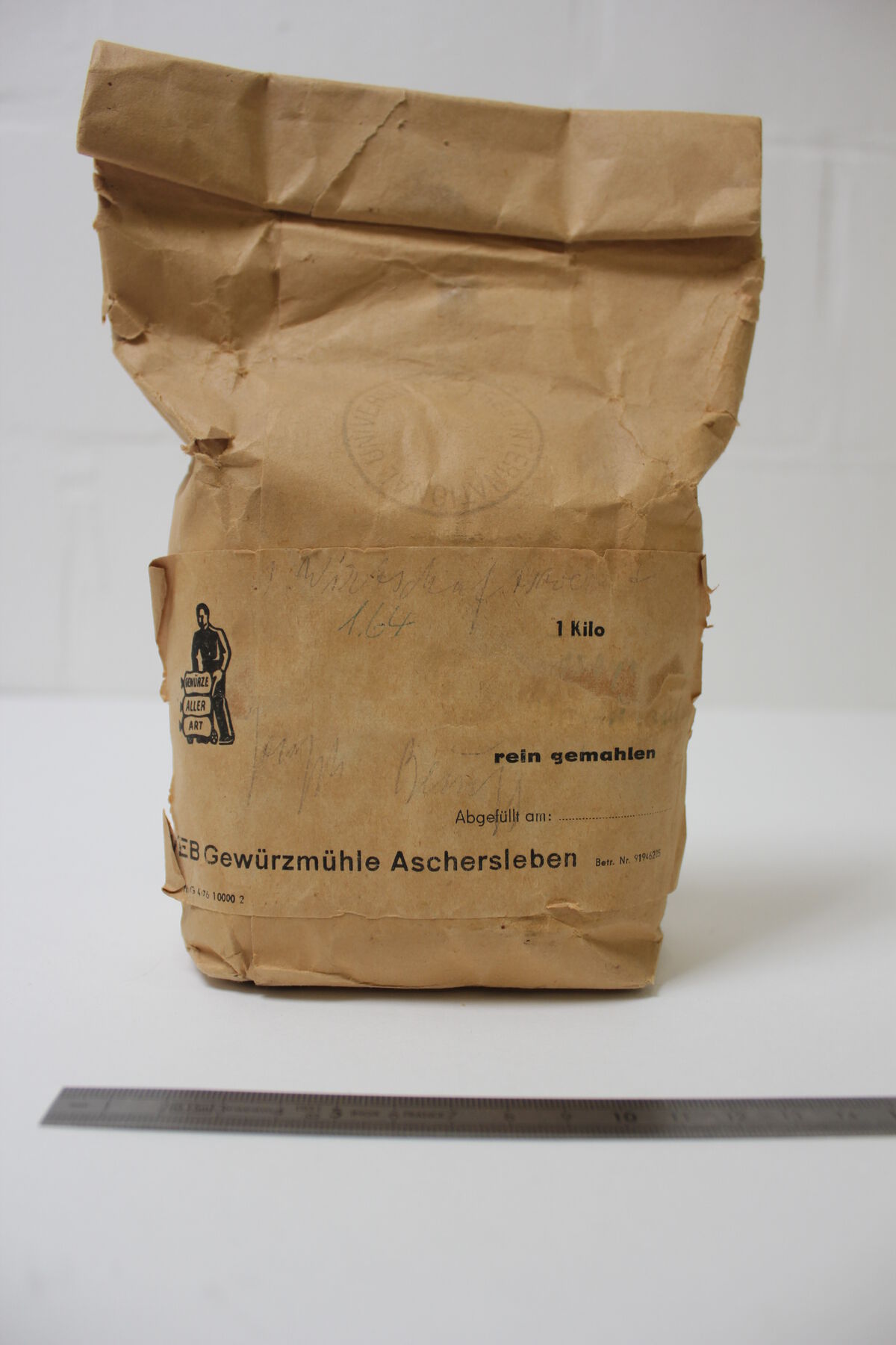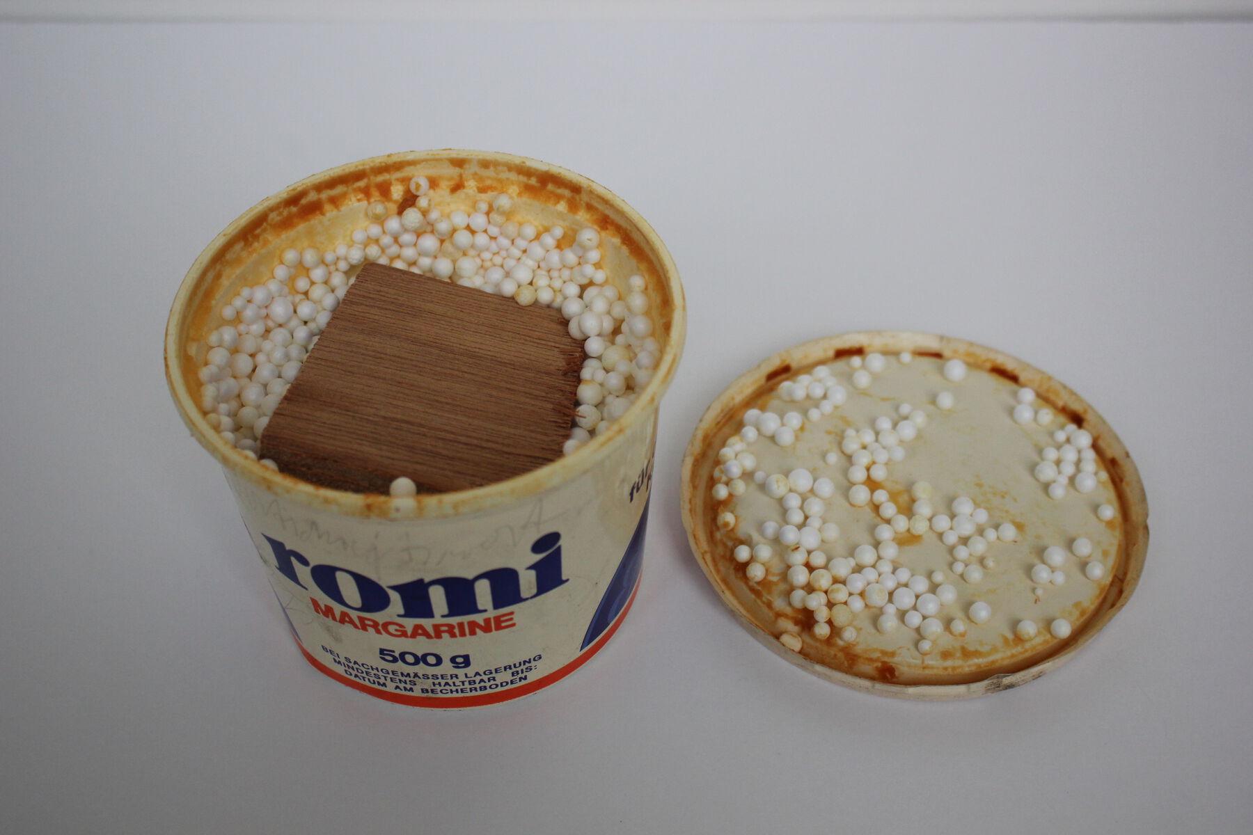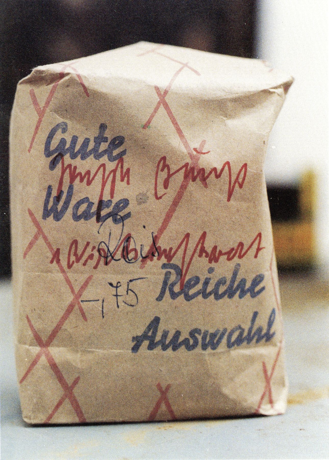 Figure 17.7The next step is a consideration of a material that gives the packaging the “look and feel” it had with its original enclosed matter. Günter Schott, a former conservator at the Hessisches Landesmuseum Darmstadt who often worked with Beuys, and even restored some works together with the artist, said that to him, it is clear that when restoring works by Beuys, “one cannot use any material that looks like the original but being something else. One should always use the original material” (, 72). In the case of Wirtschaftswerte, the condition of the original packaging makes it ineligible for replacing non-original content with new, “original” content. If the package is unique, the suitability of the current contents is evaluated. If it has caused or still causes damage to the original packaging, or when the weight of the whole doesn’t match the information on the packaging (for instance if a one-kilo bag of salt is filled with polystyrene balls), this can be defined as an unsuitable filling.