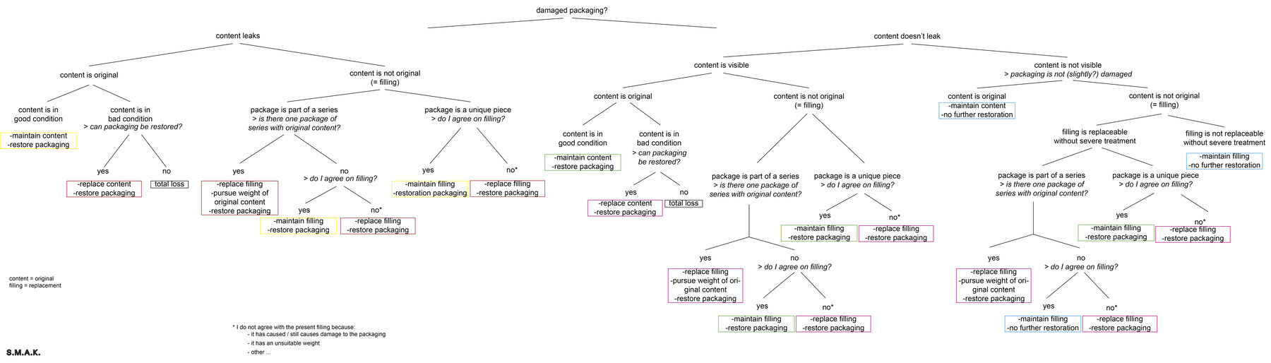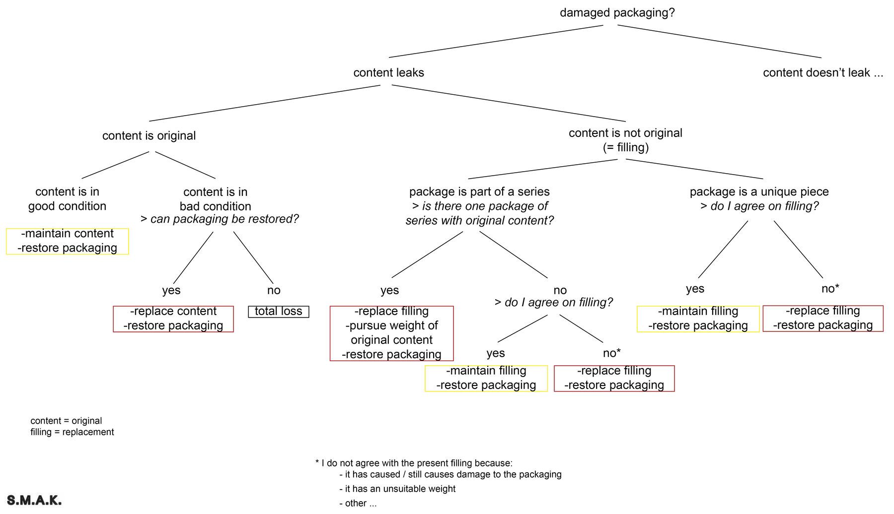 Figure 17.6The model starts from the following question: “Is the package leaking?” The answer to this question can be yes or no. If a loss of content is noted, further steps proceed on the left side of the decision tree (fig. 17.7). Every effort is made to retain original contents unless they are in poor condition or pose a threat to the condition of the packaging. When the original packaging is in such bad condition that no restoration treatment can improve its structure or appearance, the package might be considered a total loss. If the contents are not authentic, the presence of similar or non-similar packages and their content is considered. If there are several identical packages present—called “a series” in the model—and one or more of them still contain original content, this is taken into account when considering a replacement material.