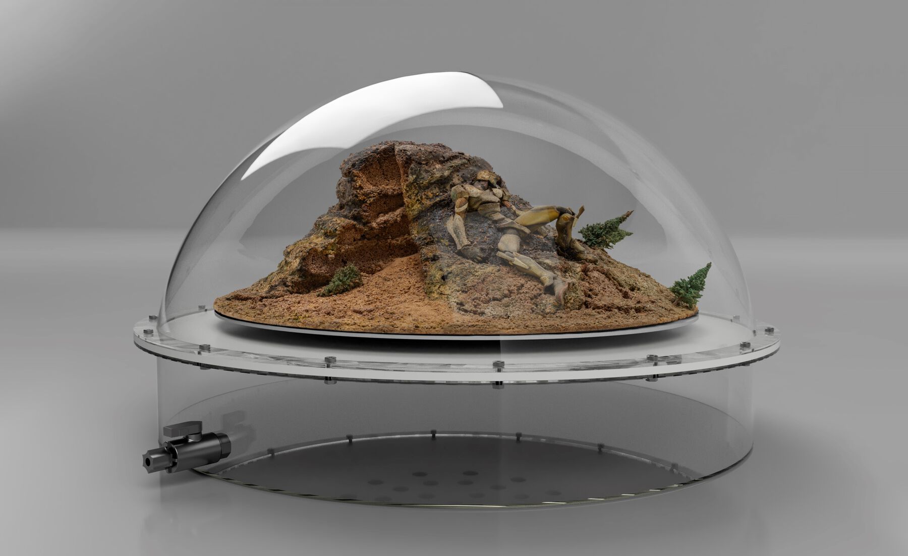 Together with the Swedish National Heritage Board, the conservators started planning for an oxygen-free storage solution for the cake. A transparent hemisphere shape was chosen to minimize the amount of air and to facilitate monitoring. When a digital sketch was rendered, it was reminiscent of a hibernation pod, a recurring reference in Villar Rojas’s work (fig. 18.10). There were sci-fi connotations and suggestions of a survival sphere connecting it to the last-art-object-on-Earth thoughts, and to the aesthetics of later Villar Rojas projects.5 This, in turn, led to the idea of a combined storage and showcase solution, a way to permanently keep the piece in an oxygen-free environment.