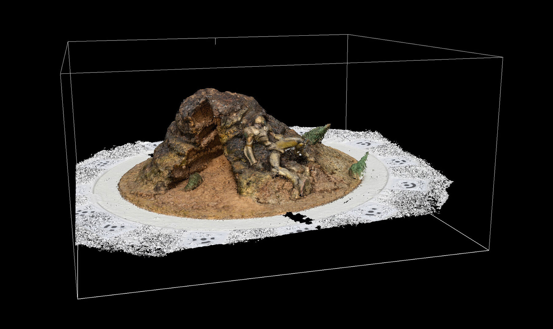 Possibilities for documenting changes in dimension, shape, and color are also being sought. A first step was to perform photogrammetry to generate a 3D model of the sponge cake (fig. 18.9). Care was taken to document the performance of the photogrammetry in order to accurately replicate the investigation at a later time, so as to visualize dimensional and color changes; specifically, small hidden markers were placed under the base plate of the cake to facilitate comparative photogrammetry in the future. This method, if successful, could be applied to all the Villar Rojas objects.
