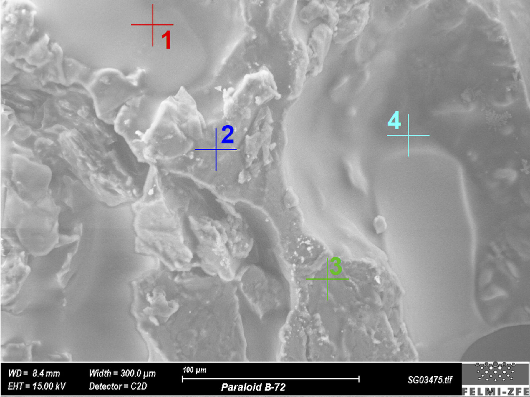 Figure 21.10The results of light microscopy were also confirmed using a sophisticated Raman-SEM technique (). Two correlative Raman-SEM measurements of an unembedded part of the sample were performed. The SEM’s good depth of field was used to obtain reasonable images, and Raman point measurements were used to confirm the chemistry (fig. 21.11a, fig. 21.11b). The results obtained also showed the presence of droplets of Paraloid B-72 on the top of the bread.