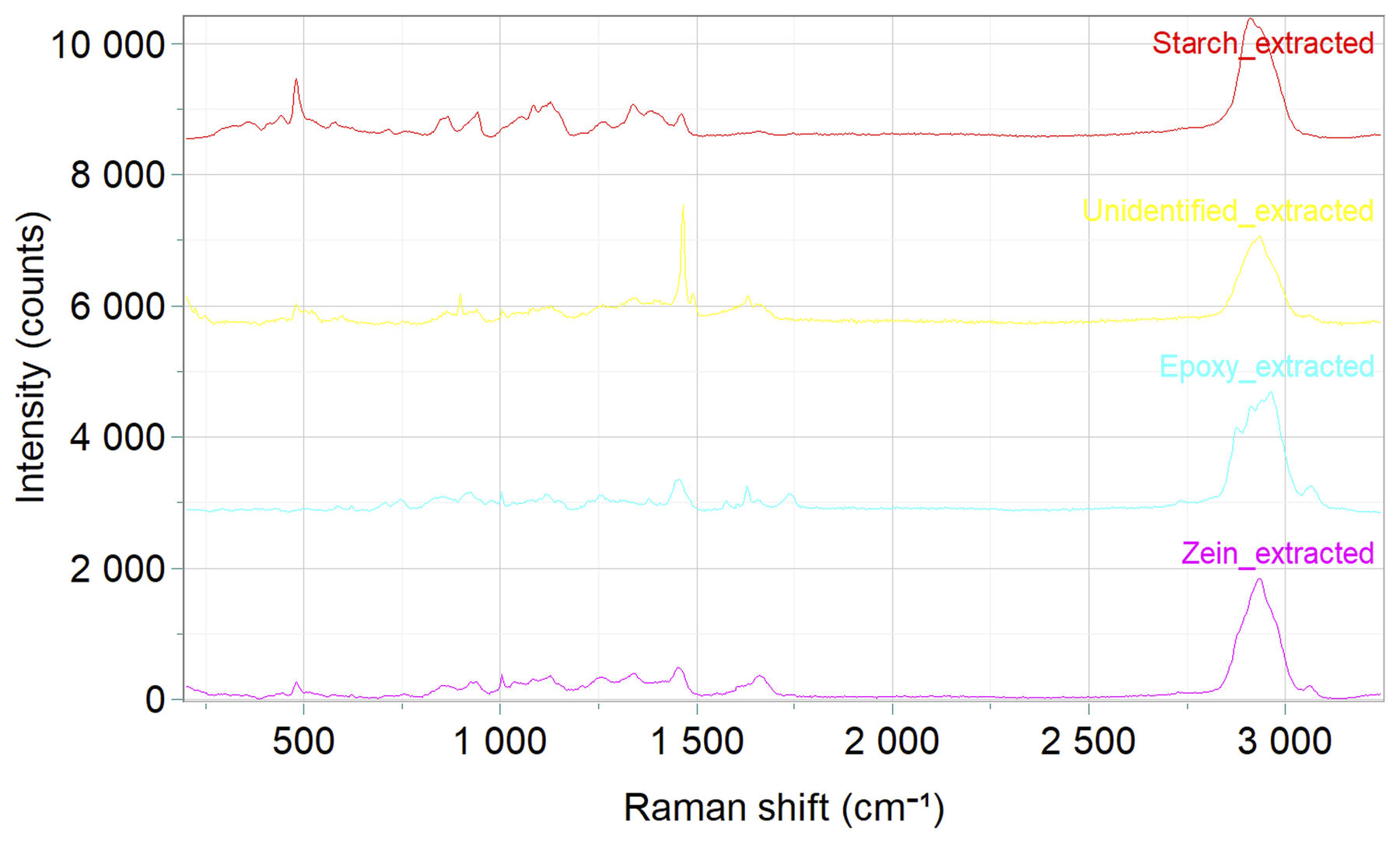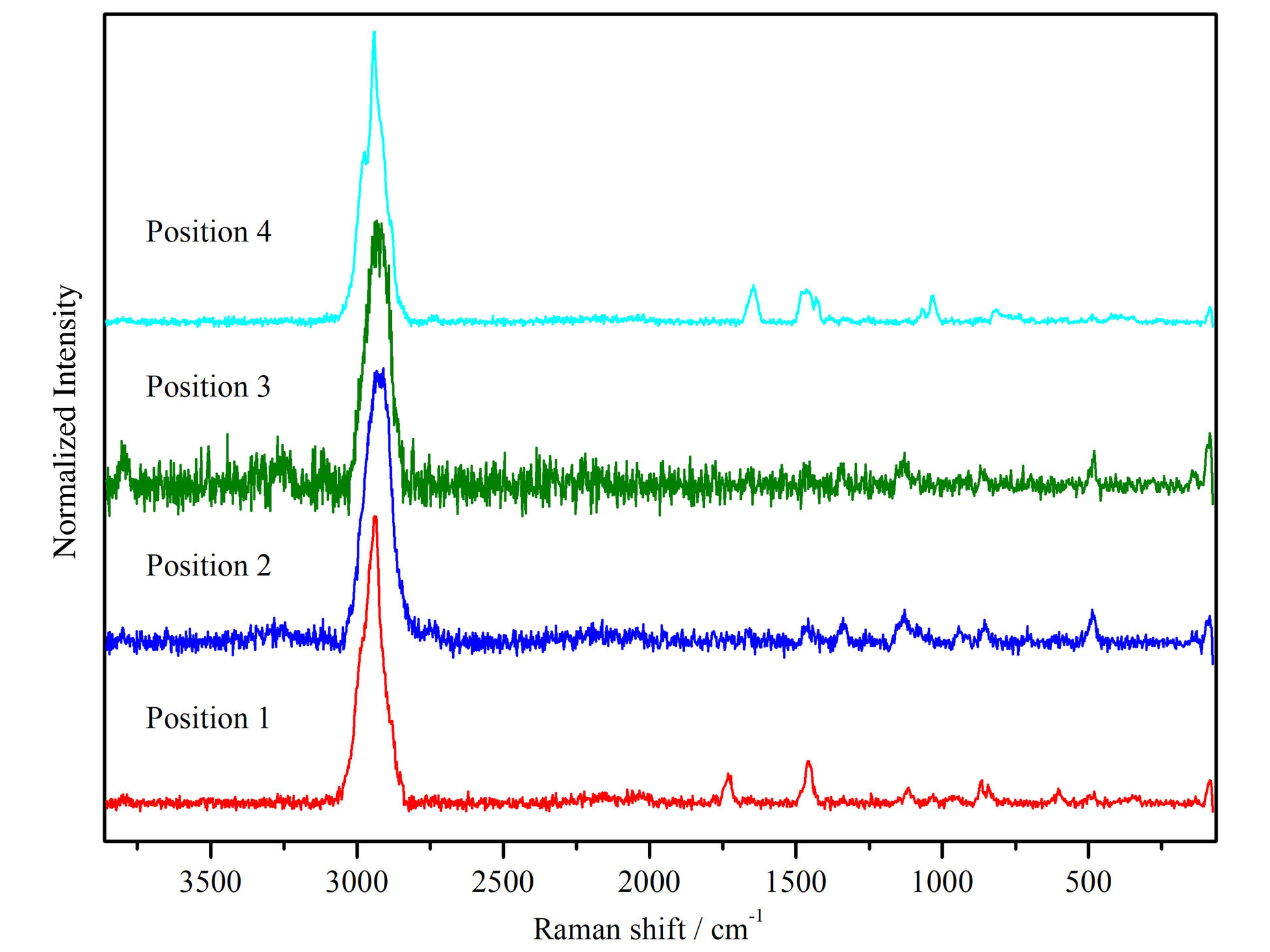 All other samples were analyzed in precisely the same way, and the same results were obtained for all the consolidants used (Mowilith 50, Aquazol 200, and Aquazol 500) (results not shown) through optical microscopy. Large droplets of consolidants had formed. Some droplets of the consolidant were found on the treated bread, but the threads of the bread were not completely covered by any consolidant, which was in each case confirmed using Raman point measurements. These measurements confirmed the results of the mapping of all analyzed samples, with some positions showing consolidants and others showing no consolidants (). The inhomogeneous distribution was observed in all analyzed samples.