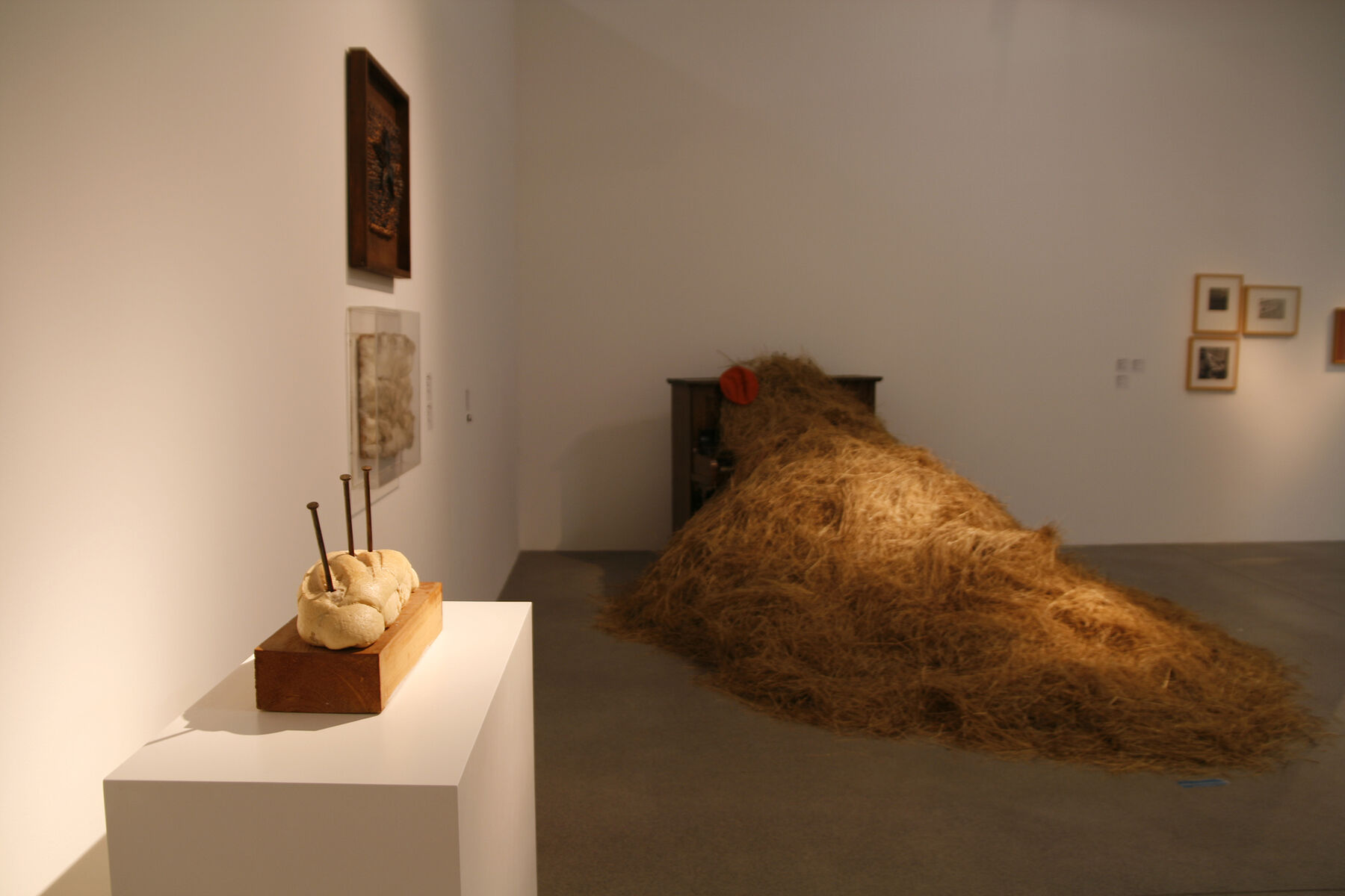 In 2009 the MSU moved to a new purpose-built building, where Nailed Bread was exhibited as part of the permanent collection from the very beginning. The permanent collection is not static, but periodically rotated within the gallery space. In 2010 Nailed Bread was exhibited in close proximity to other organic materials, such as Philip Corner’s installation Piano Bed (1999, fig. 21.2), which is made of an upright piano, hay, and a cap. This probably contributed to the changes that were noted on the bread in the same year, almost four decades after its creation.