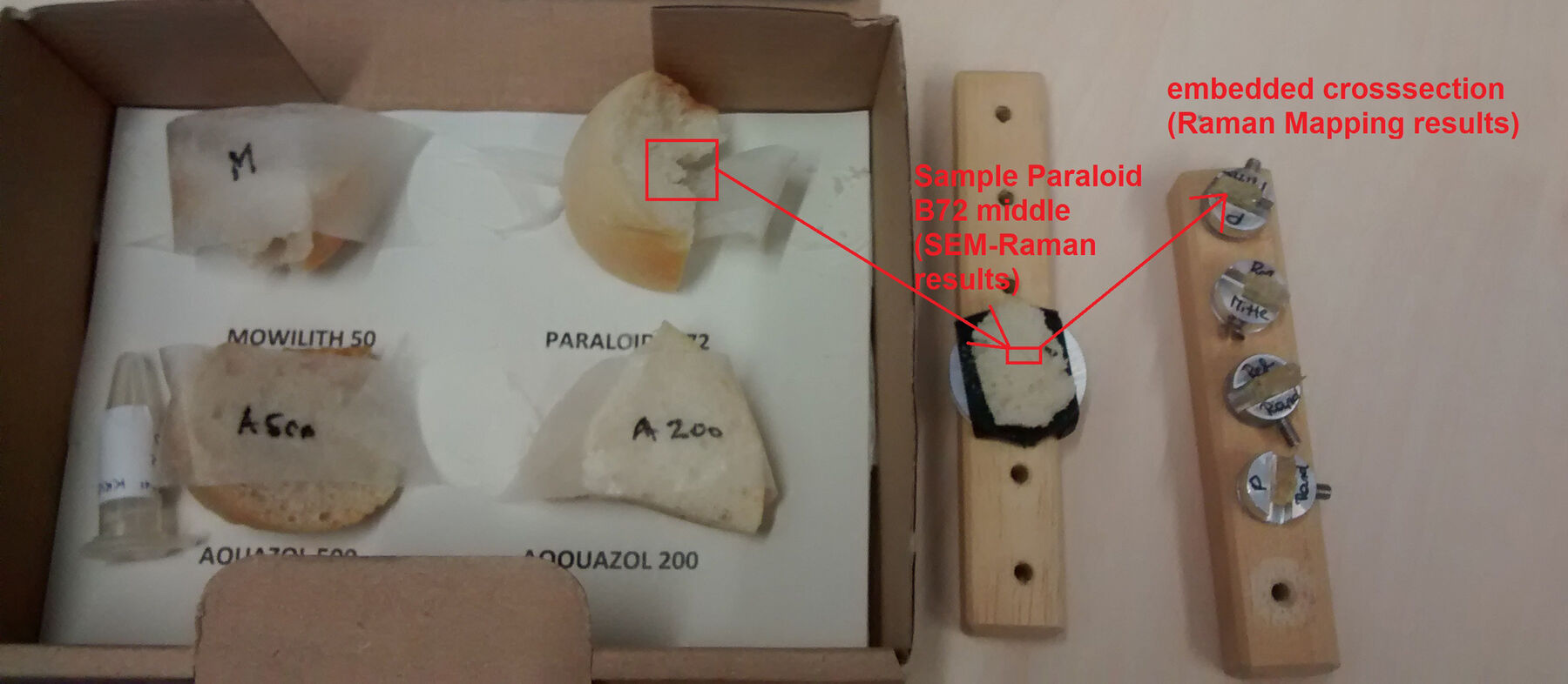 Consolidated bread samples with various resins and concentrations were prepared and cured. These included samples of the original bread consolidated nine years ago as well as the newly prepared and consolidated samples. Samples used for SEM-Raman microscopy were prepared by simple cut. Parts of these samples were embedded in epoxy resin using flat embedding molds, dried at room temperature, and cut with ultramicrotomy (Leica UC6; Histo diamond knife) in order to produce a flat block surface for microscopic measurements and for Raman mapping (fig. 21.7).