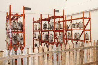 Contemporary artworks containing biological materials such as food, bodily fluids and/or tissues, plants, animals, and animal parts pose specific challenges for museums, conservators, and collectors. They are prone to illness, decay, putrefaction, and eventual disappearance, which makes them difficult to exhibit and preserve for future museum visitors. In the case of this exhibition, numerous challenges presented themselves. Confinement of live chickens in an environment that is too hot or cold, without sufficient ventilation, without regular cleaning or hygiene, or without adequate feed or water can cause illness, stress, even death. A hot environment also causes the decomposition of chicken eggs. Mushrooms will likewise not survive if they are exhibited in an unregulated environment; overly hot temperatures, lack of humidity, or inadequate watering can all result in wilting and decomposition. In light of all this, the exhibition of live chickens, chicken eggs, and mushrooms required an understanding of issues that are vital for their preservation.