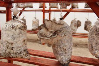 Govera further explained that they housed the mushrooms in polyethylene bags to keep them fresh (see fig. 8.3a, fig. 8.3b) and highlighted a long process that started with the humidification, pasteurization, and incubation of the bags before the gallery installation. Nutrients for mushroom growth were added to the bags as part of the incubation process.