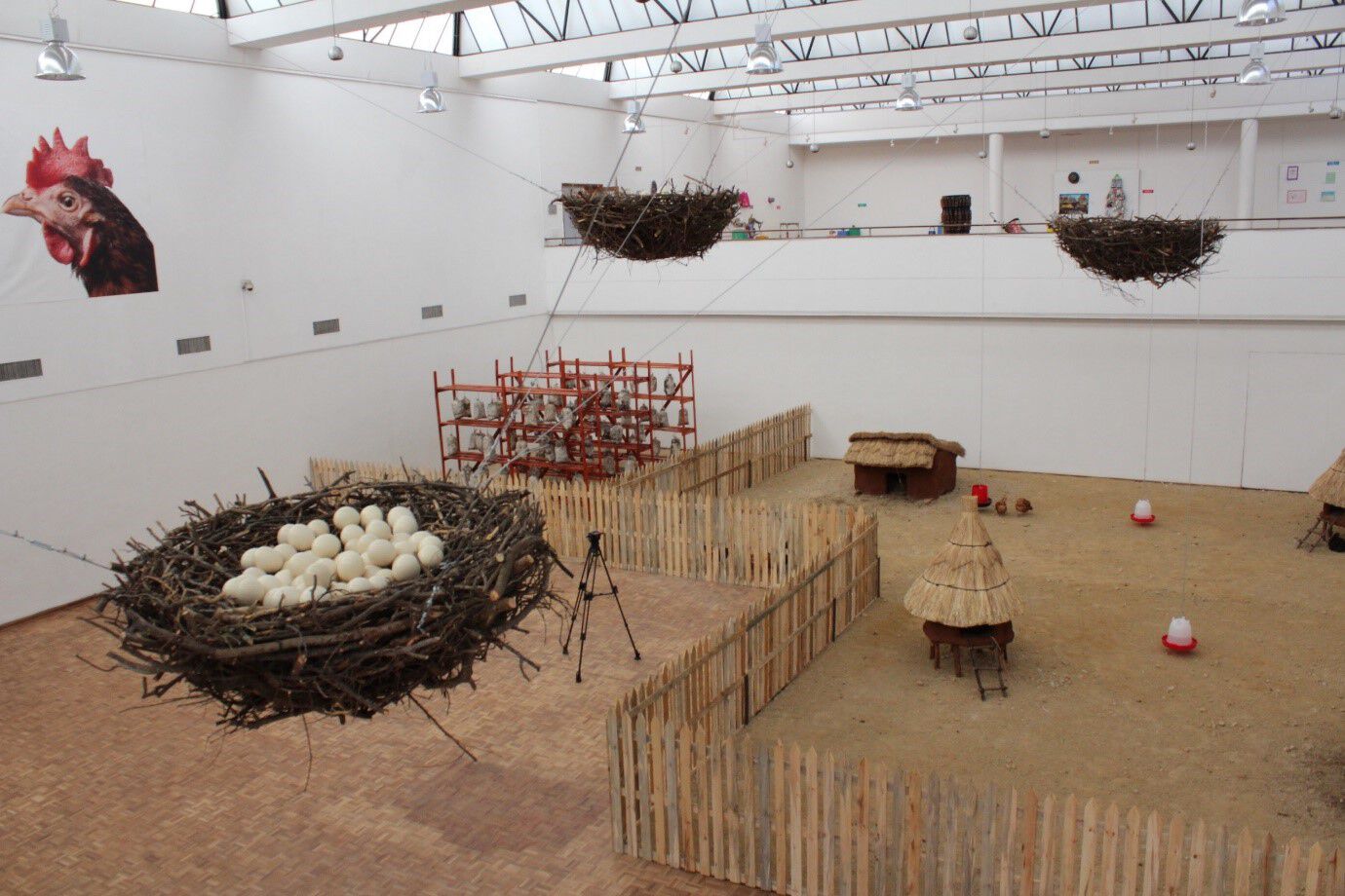 The exhibition team created an all-encompassing installation, transforming the Courtauld Gallery wing into a representation of a farmyard (fig. 8.4a, fig. 8.4b) with enough space to allow free air circulation, which in turn created a cool environment, preventing stress and suffocation of chickens or rotting of the chicken eggs and mushrooms. The exhibition team added soil to the main ground-floor space along with a wooden palisade fence—an enclosure mirroring a typical fowl run. The fowl run allowed for free movement of the chickens and ample space for them to forage living organisms in the soil.