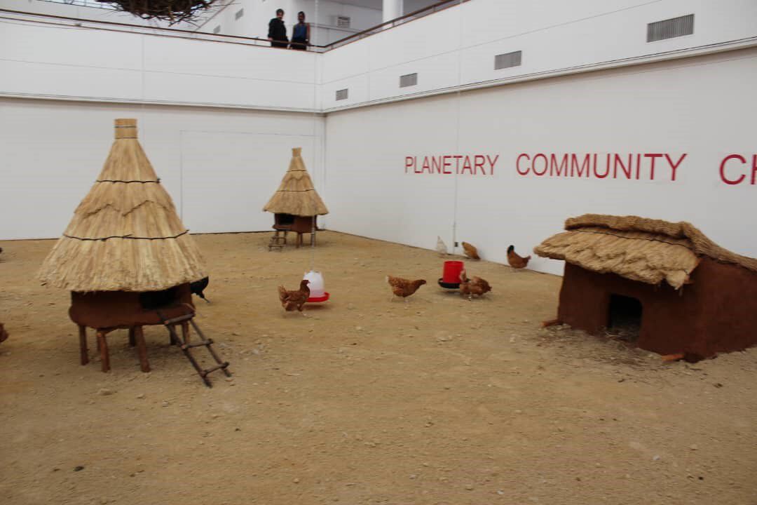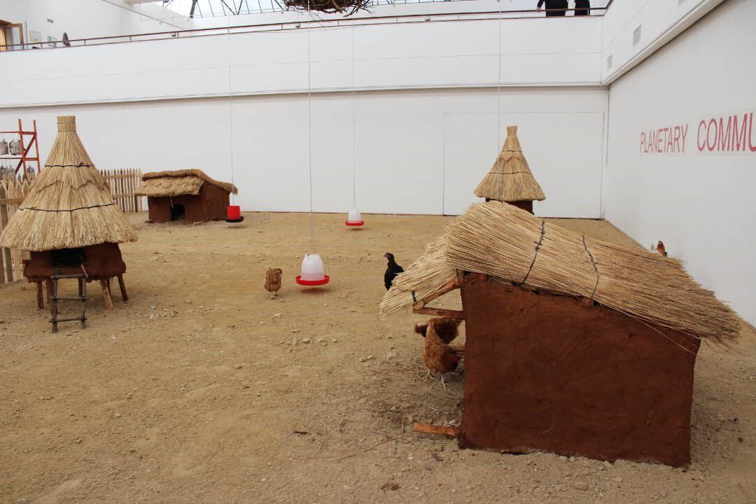 Planetary Community Chicken was the first show of its kind in terms of exhibiting living matter at the National Gallery of Zimbabwe. Its goal was to leverage the museum as a respected public platform to empower people with the knowledge necessary to diversify their agricultural activities, specifically through the production of chickens, eggs, and mushrooms for self-sustenance (mushrooms are an excellent source of fiber and protein).