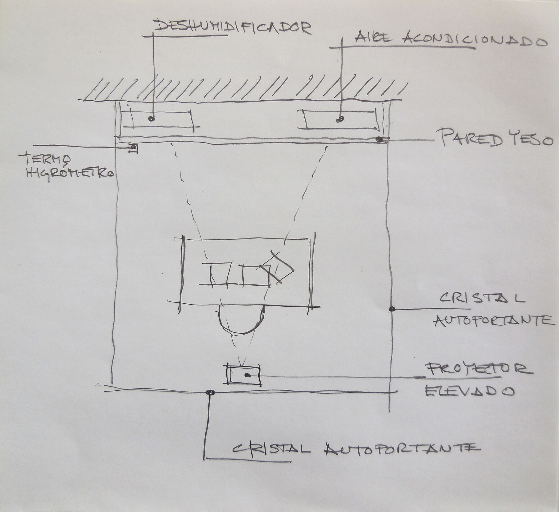 The proposal is to exhibit the installation inside an enclosure with side walls and a glass wall in front, a double back wall of white plaster with access for staff, and a lightweight roof. The size and type of lighting will depend on the curatorial proposal and the funds available for carrying it out. Inside will be a dehumidifier and an air-conditioning unit to maintain the appropriate environmental conditions to prevent possible condensation on the front glass wall. Ideally, the exhibition hall should have controlled conditioning of temperature and relative humidity. The video projector will be placed inside the enclosure, centered with respect to the desk, and the audio will play outside the enclosure, near the projector, following the instructions in the assembly protocol. A drawing of the proposal can be seen in figure 14.10. The need to refresh and filter the air should be assessed ().
