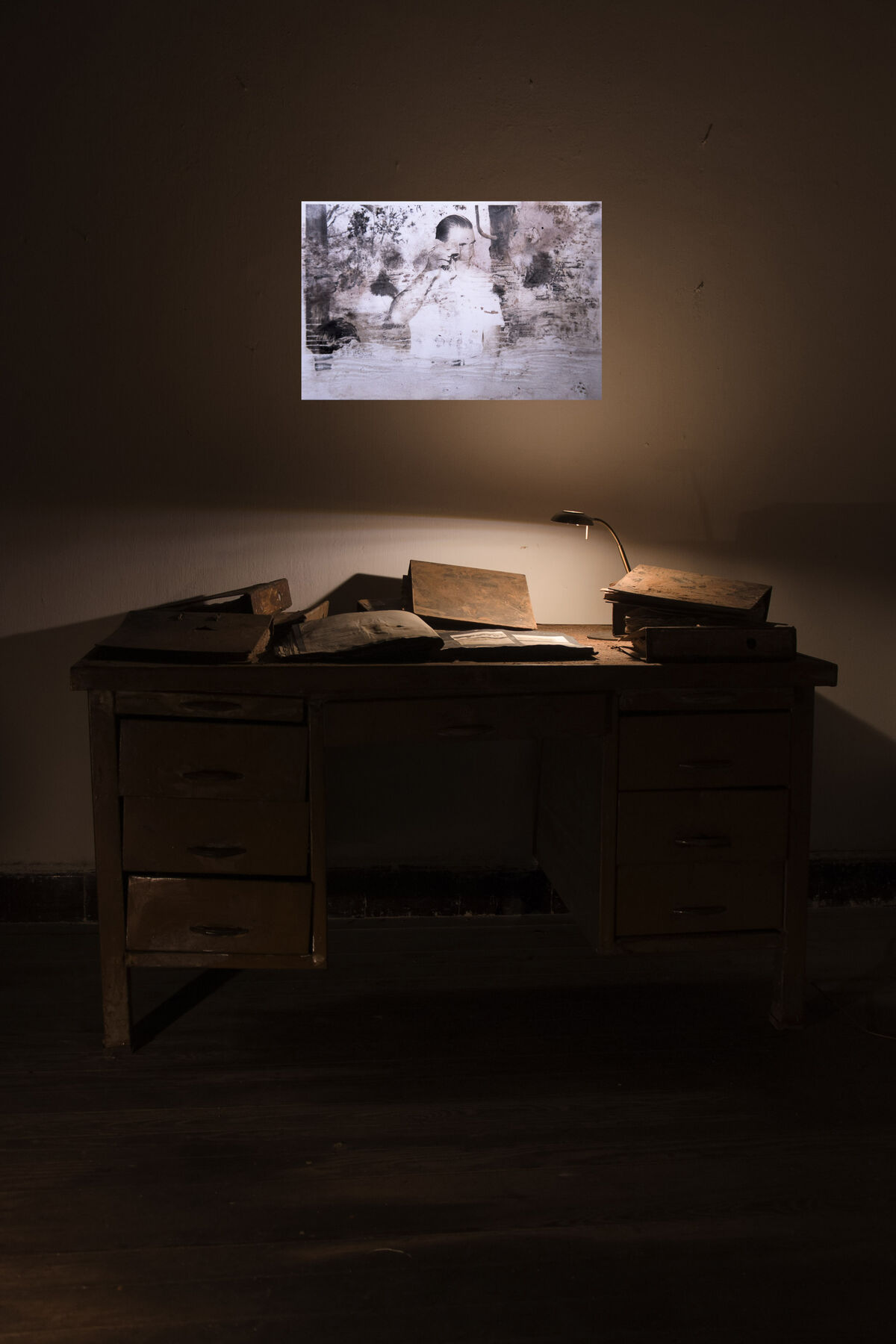 The installation Lo que mata es la humedad (It’s the Humidity That Kills, 2017, fig. 14.2, fig. 14.3) by Uruguayan artist Federico Arnaud (b. 1970) won Second Acquisition Prize in the Montevideo city government’s 2017 Premio Montevideo competition (the new name for the Salones Municipales). The installation consists of a metal desk with a swivel office chair and a portable lamp, which directly illuminates a photograph album and nine binders.1 The desk has a surface layer of dirt that was applied by the artist in the form of mud. Dirt also covers the outsides of the binders and the other elements, with the exception of the album. A video is projected on the wall behind the desk, showing photographs from the album in slide format. An audio track accompanies the imagery in the video; the sound of a working slide projector bursts with each new image that appears.