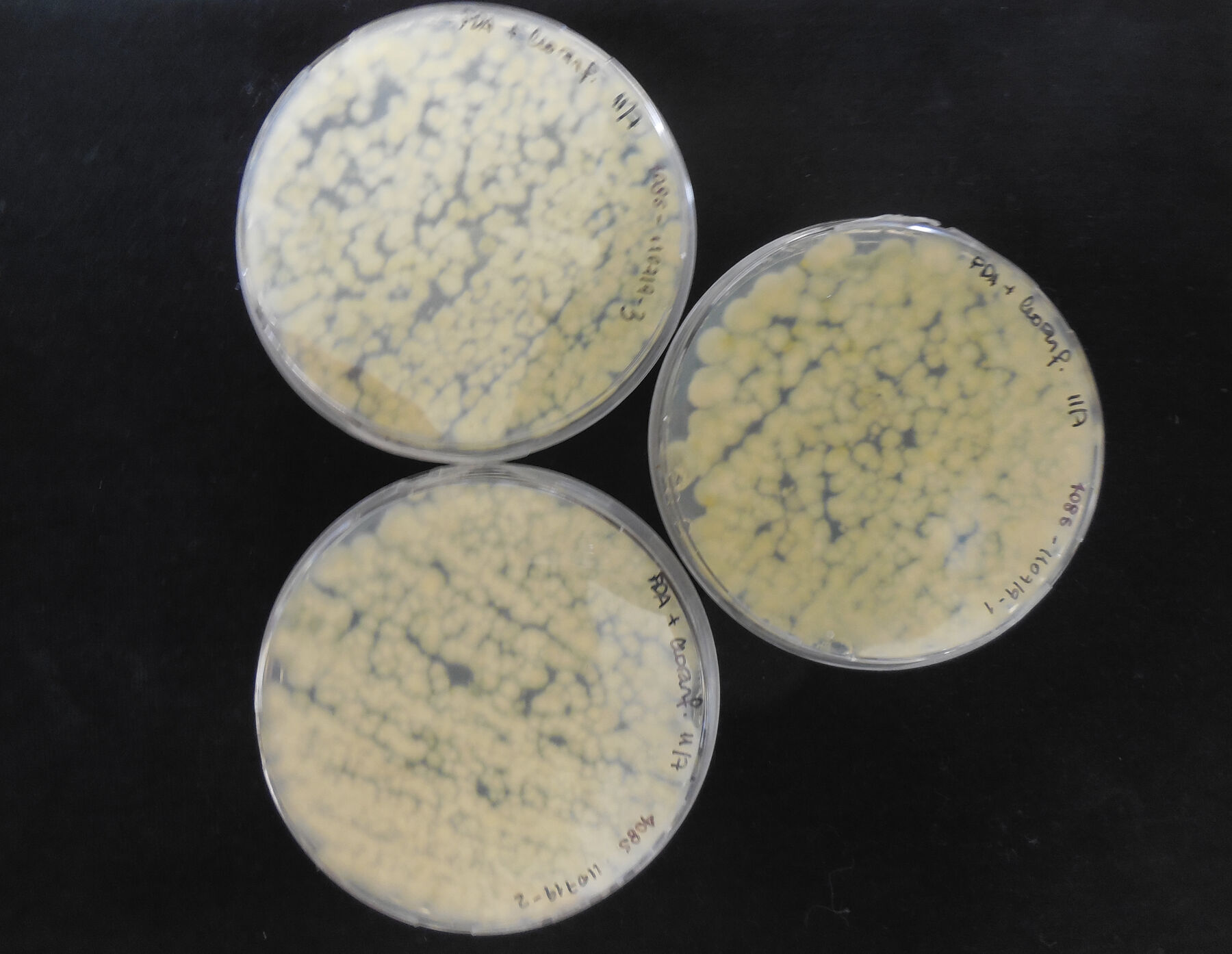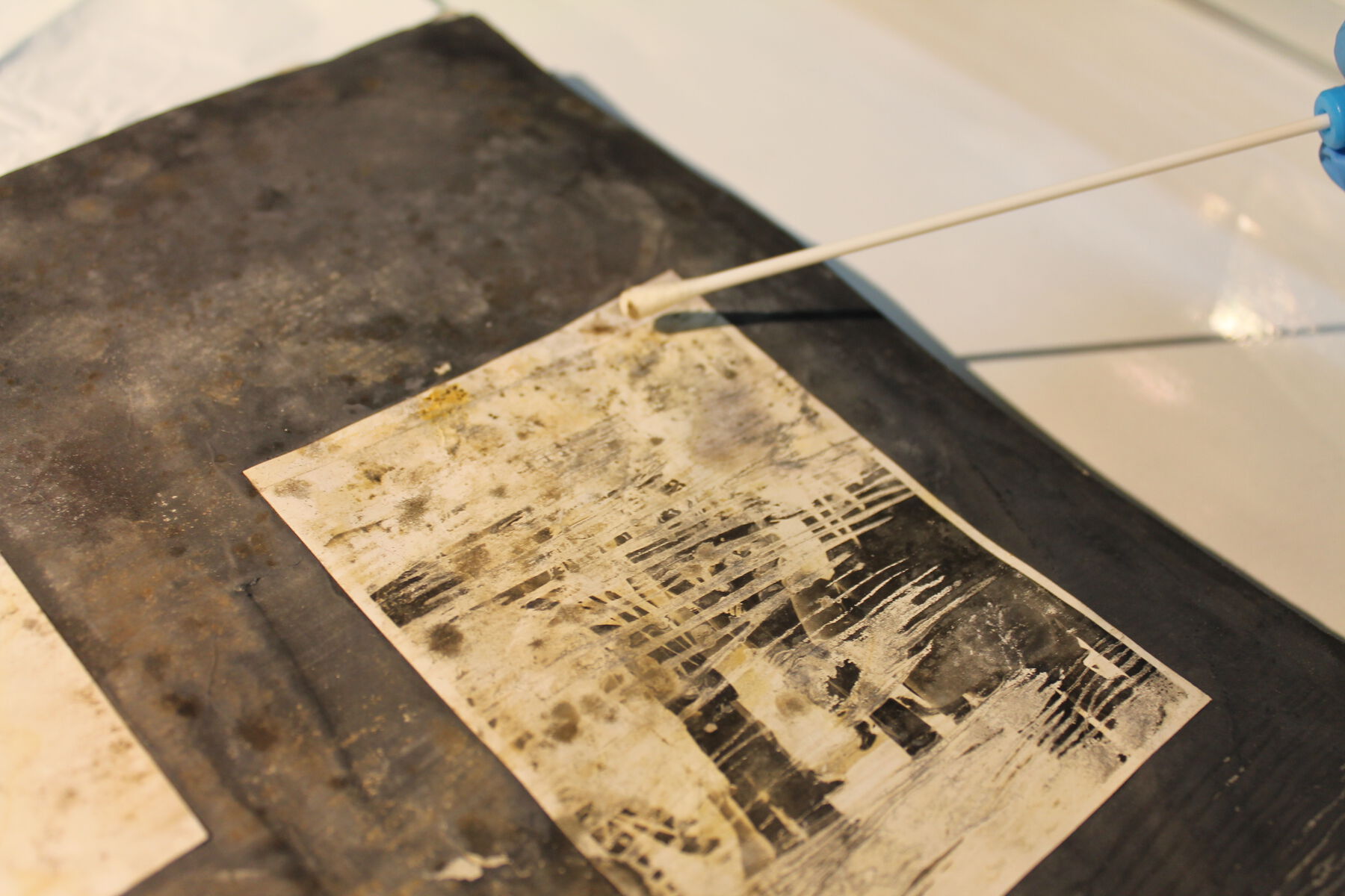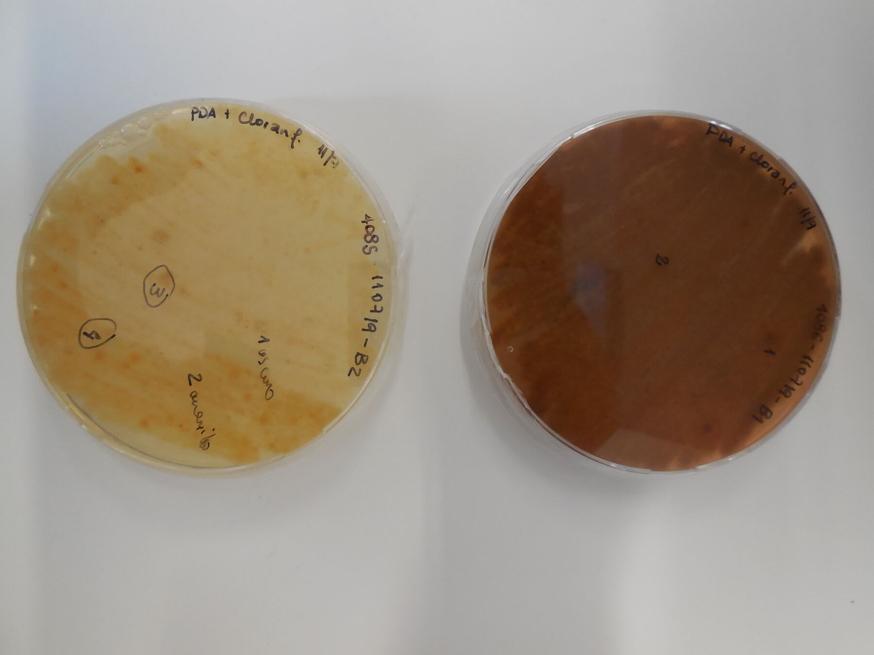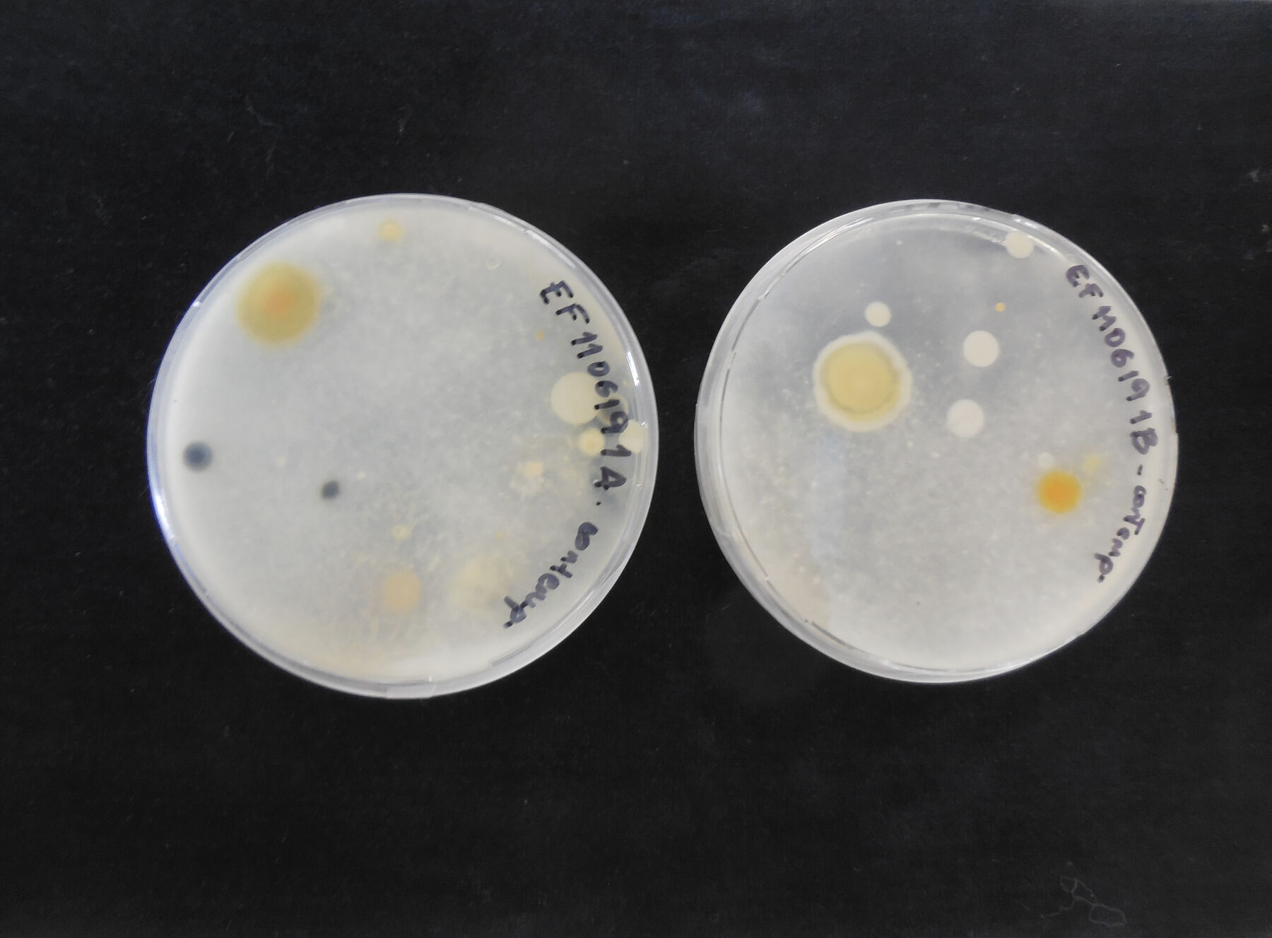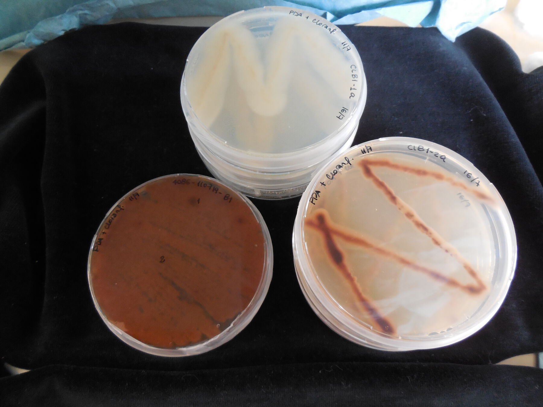 For the study, samples were taken from three photographs from the album and the exterior surface of one binder. The samples were taken in the museum, in triplicate, using sterile commercial cotton swabs minimally dampened with physiological saline solution, sampling areas where the presence of mycelium and stains, apparently from mold contamination, were observed (fig. 14.4). The swabs were immediately put into test tubes with NaCl 9 g/L (physiological serum) for transportation. In the laboratory, the samples were inoculated in petri dishes with potato dextrose agar (oxoid) (PDA) with chloramphenicol and incubated at 25°C, in the dark, for five days. After the growth period, to obtain pure cultures, three petri dishes with PDA were inoculated consecutively and incubated at 25°C for five days. In the cases in which isolated colonies were not obtained, monosporic cultures were performed, making adequate dilutions with spores of the mold under study, introducing them into the PDA and incubating them at 25°C for five days (fig. 14.5, fig. 14.6, fig. 14.7).