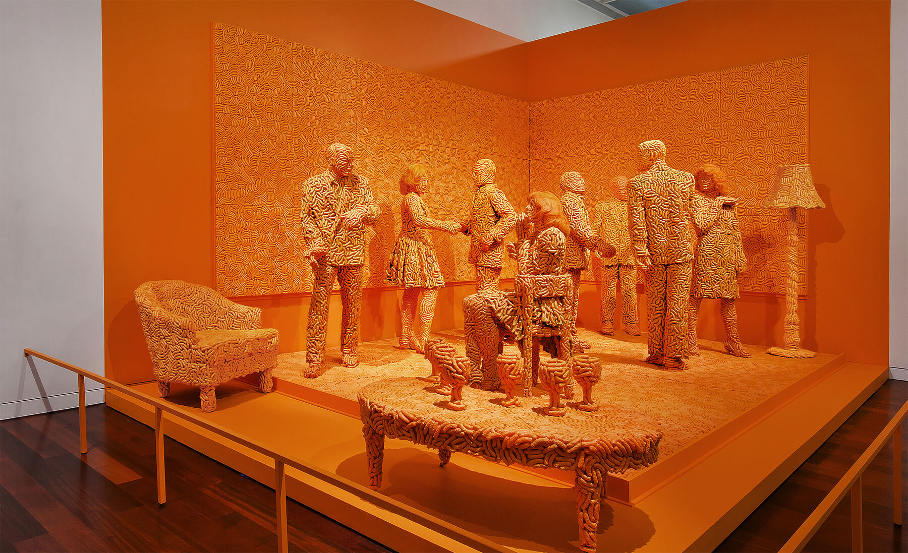 The first group comprises edible art objects that the artist has endowed with an emotional charge, sensitive to human relationships with this type of food item. This group, which conveys sensations and reactions, utilizes the physical, formal, and material qualities of the food products to create a connection with viewers. These objects are sometimes treated chemically so they will not change over the course of the exhibition in which they will be presented, as is the case depicted in figure 2.2, where in 1992 Sandy Skoglund stabilized Cheez Doodles chemically to keep their peculiar color and form.