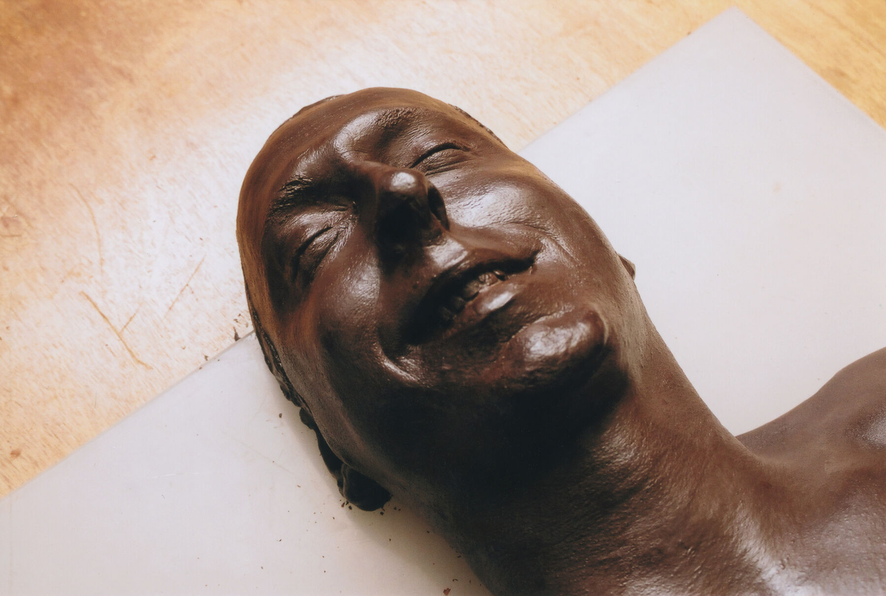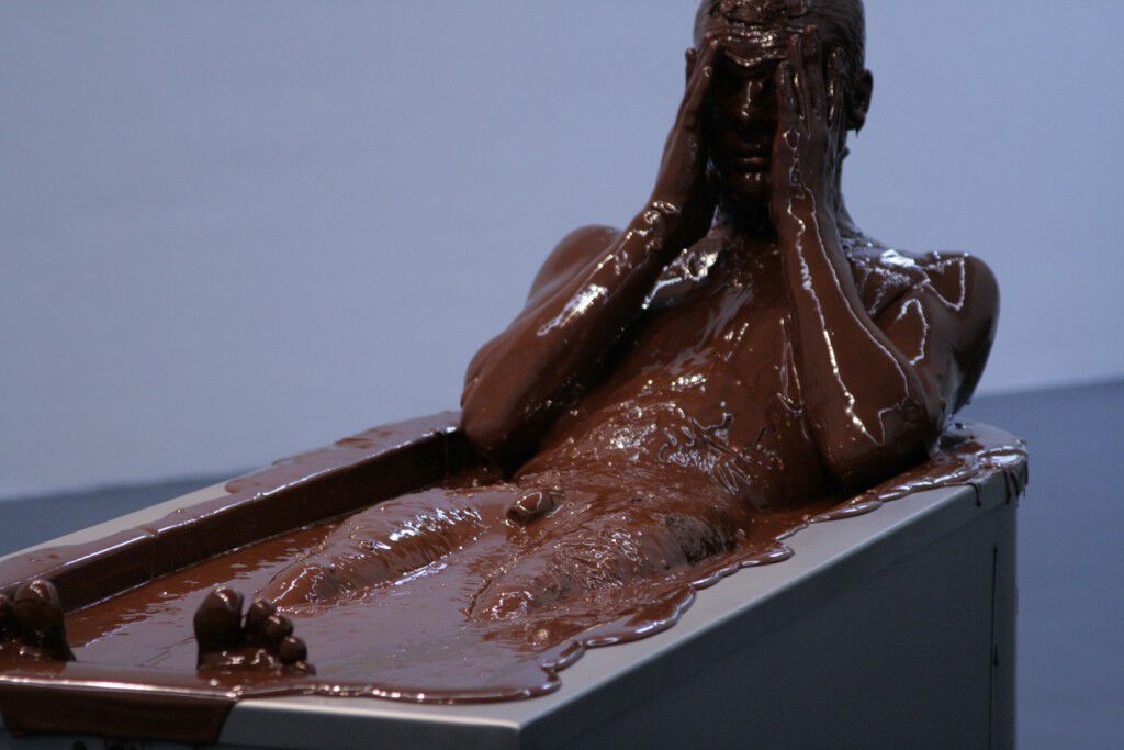 To put forward just one example, a great number of artworks use chocolate as a raw material. Three case studies are discussed here, each representing one of the typologies described above: Sonja Alhäuser’s Braunes Bad V (Brown Bath V, 2009/2015, fig. 2.4), Laurent Moriceau’s Found and Lost #1 (2003, fig. 2.5), and Janine Antoni’s Lick and Lather (1993, fig. 2.6). All three are made with edible milk chocolate. All three are portraits of the artists. But they differ by period, size, and above all function.