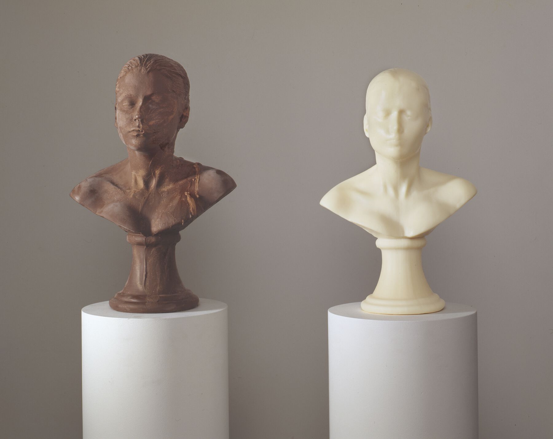 Antoni’s Lick and Lather began with a mold of the artist’s own head that was used to cast seven iterations with soap and seven with chocolate. These self-portrait busts observe us in a challenging manner, like bishops on a chessboard, but we cannot eat them or touch them; we can only observe them and witness their transformation over the years. Antoni uses the soap bust to wash her body, and she licks the surface of the chocolate bust with each encounter. She has specifically prohibited these actions from being undertaken by anyone but her.