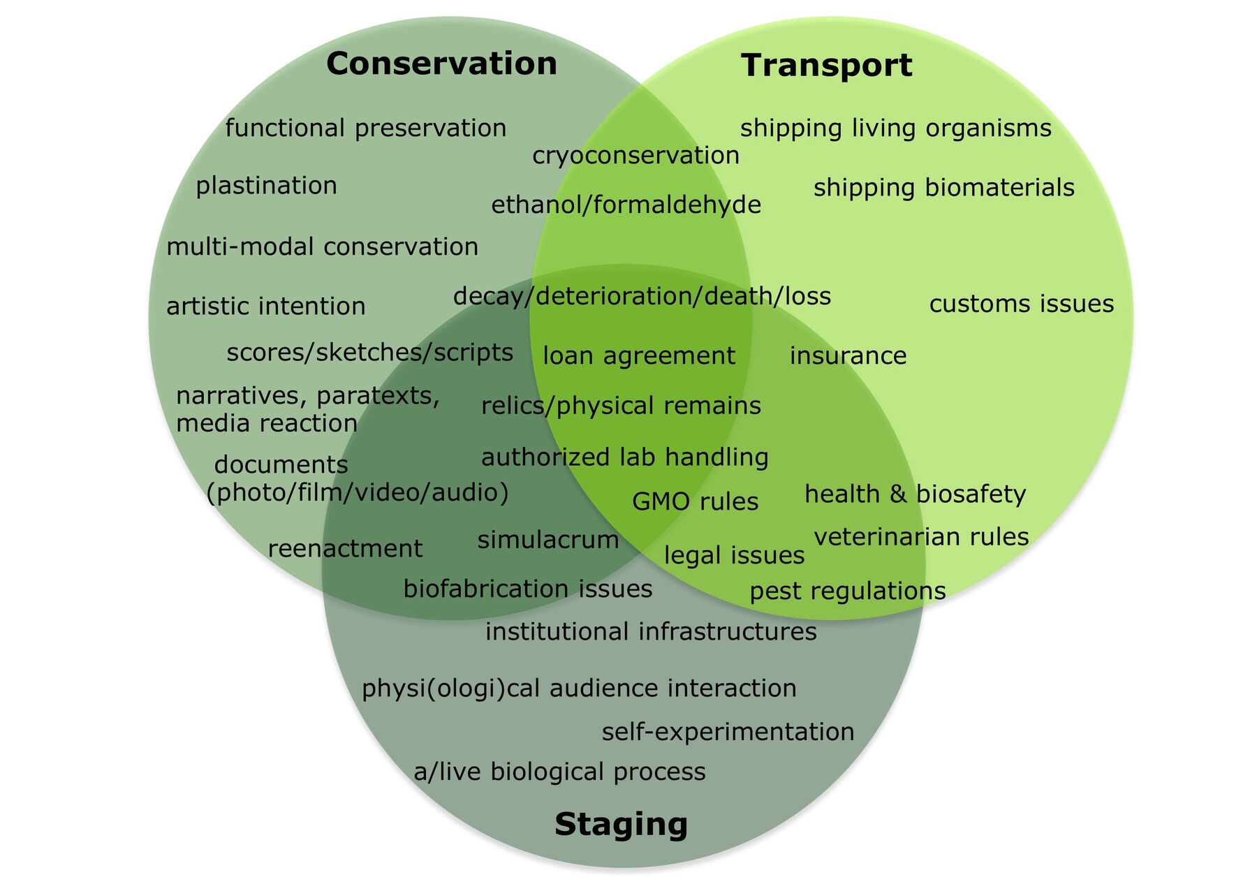 Devoid of institutional advocacy, the third category lacks any coordinated methodology, since these practices cut across many disciplines, from art to natural history, medical, and design museums, media art and performance festivals, biotechnology and bioethics, and are still only supported by a few collectors ready to engage with the subsequent challenges beyond conservable objects. Some of the challenges of biomedia art present similarities to those of performance art—especially as their actual presence may not only be reenacted but “survive” in the form of documents or physical remnants (). However, the various nonhuman and techno-scientific agencies of micro-performativity (; ) involved in such artworks destabilize human scales (both spatial and temporal) as the dominant plane of aesthetic experience and link together the machinic and the organic (). The shift from organic representation to biological manipulation results in technical, institutional, regulatory, legal, ethical, bureaucratic, philosophical, and aesthetic issues with regard to museum infrastructures, the status of living organisms, tissues, and genetically modified organisms (GMOs), and their fragility when maintaining, conserving, reenacting, or shipping them.