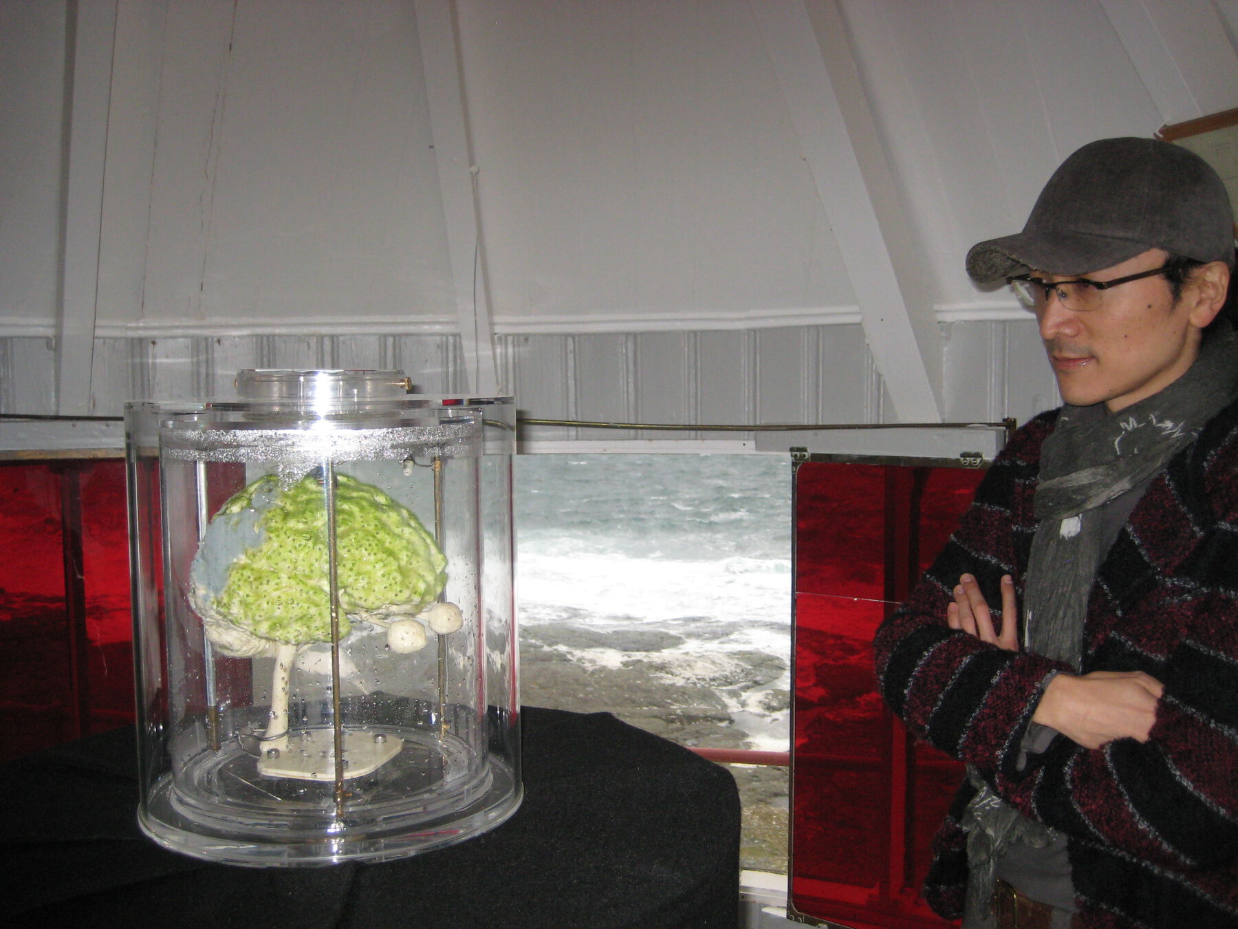 A few months later, however, a fully functional version of Light, only light made its debut as part of the Article Biennale in Stavanger, Norway (fig. 6.3).3 Here, the glowing brain sculpture was shown in the lantern room as the only form of illumination at a coastal lighthouse, where visitors were invited in to contemplate the stunning effect. This time, the organizers had decided to operate in a legal gray zone by displaying Light, only light “in transit.” A permit for contained use of genetically modified plants was obtained with the condition that the transgenic moss, after having been sent from Leeds to a laboratory in Uppsala, Sweden, and driven over the border by the artist himself, would be autoclaved at a laboratory at the University of Stavanger.