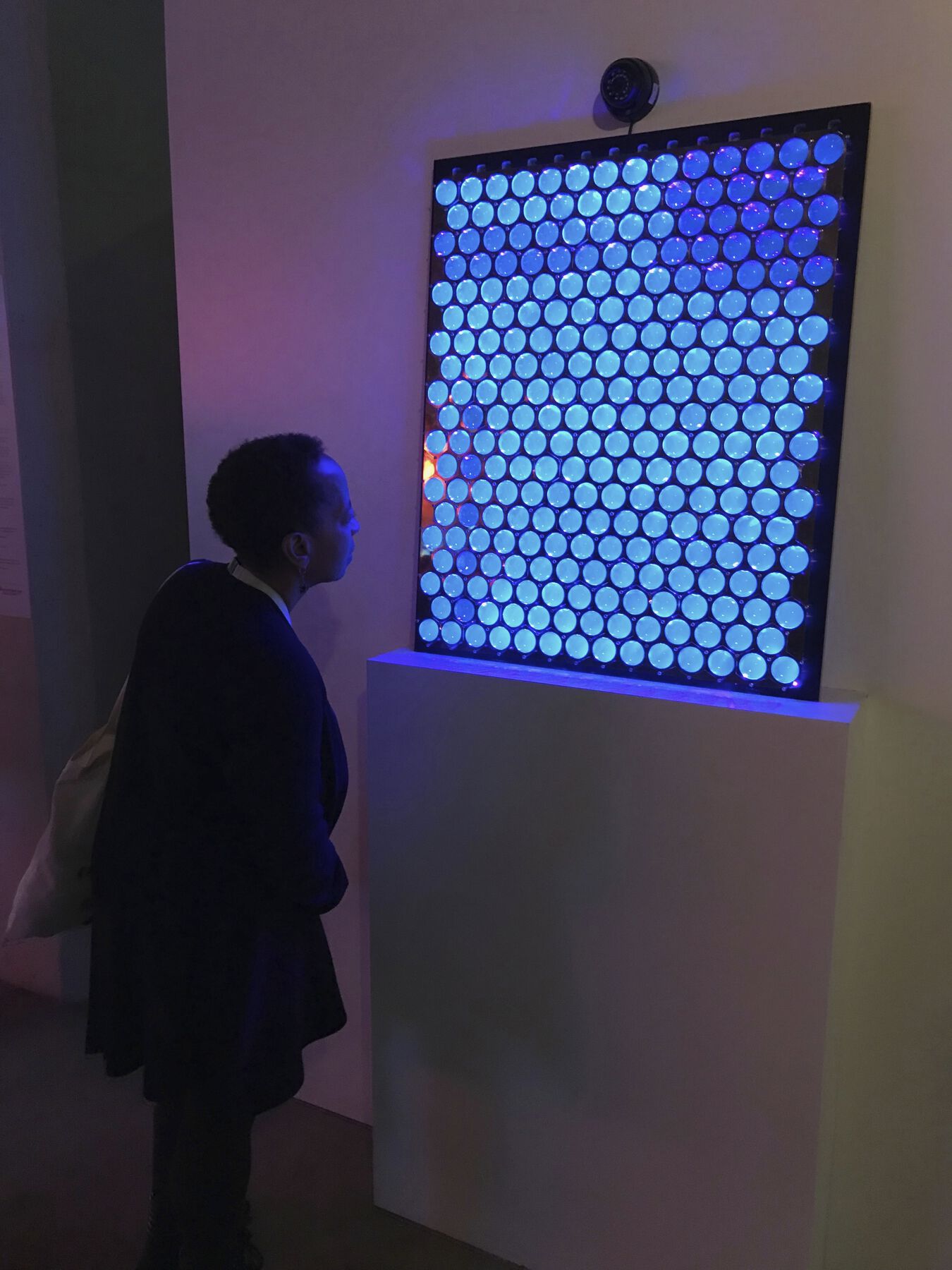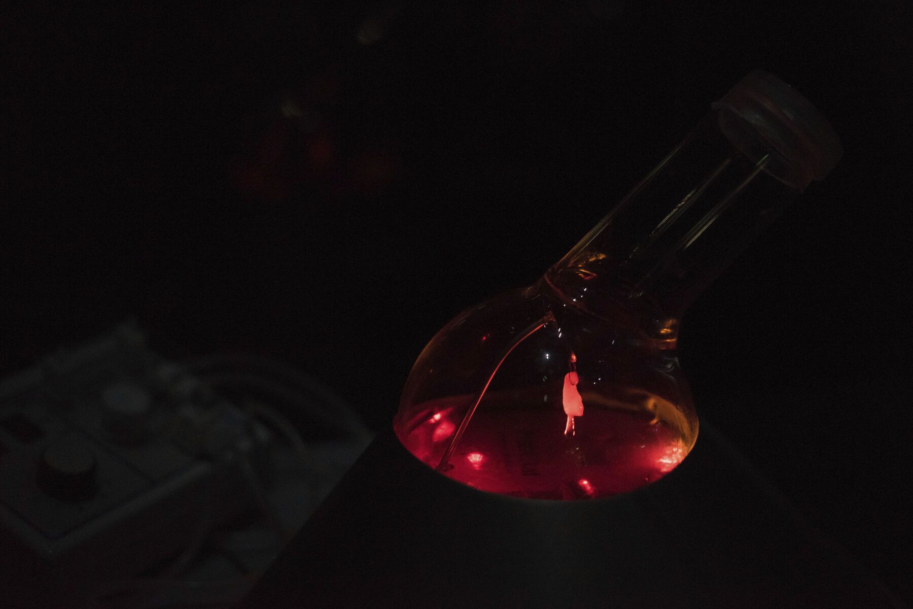 Figure 6.7An exemplary case of conservation of a complex synthetic biology-based work is Living Mirror (2013, fig. 6.8) by the artist duo C-Lab, which solves the challenge of optimizing a living biomedia piece so its function is preserved in potential perpetuity. Living Mirror uses magnetotactic bacteria’s ability to swim along the Earth’s magnetic field in order to create a living mirror image of the silhouette of its observer. Once an input image is translated into a magnetic field, the bacteria reorient their bodies in real time, causing light to scatter and create an image in a liquid bacteria culture. The piece draws on the myth of Narcissus, who fell in love with his own image in the water’s reflection, and at the same time emphasizes contemporary science’s discovery that human bodies are made up of a majority of nonhuman bacterial cells. The development of a collectible version in which this shimmer effect persists over time took several years—with bottles available for replacement in case of anomalies. Even if the bacteria die, whatever nanomagnetic chain they created would remain intact beyond their death.