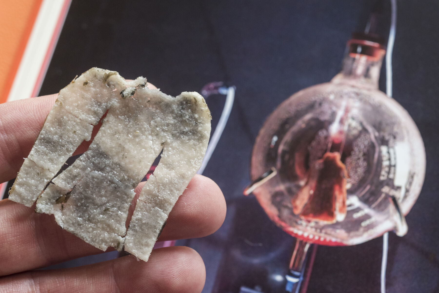 Figure 6.4Another piece by the Tissue Culture & Art Project, Victimless Leather (2004), sparked headlines like “Murder at MoMA?” when the bioreactor growing miniature leather-like jackets out of immortalized animal and human cell lines had to be stopped due to unforeseen cell proliferation taking over the apparatus in MoMA’s Design and the Elastic Mind show (). While the art died a month into the exhibition, the institution turned the failure to stage the piece as intended into a popular selling narrative. Victimless Leather was indeed performed successfully just before and after the MoMA exhibition at sk-interfaces in Liverpool and Luxembourg. Here, the question of the “afterlife” of the grown biotechnological garments was debated between the artists and the curator, resulting in the decision to have the surviving cell cultures plastinated (fig. 6.5), but to keep them strictly for documentation purposes—neither exhibit them in place of the actual piece, nor sell them.