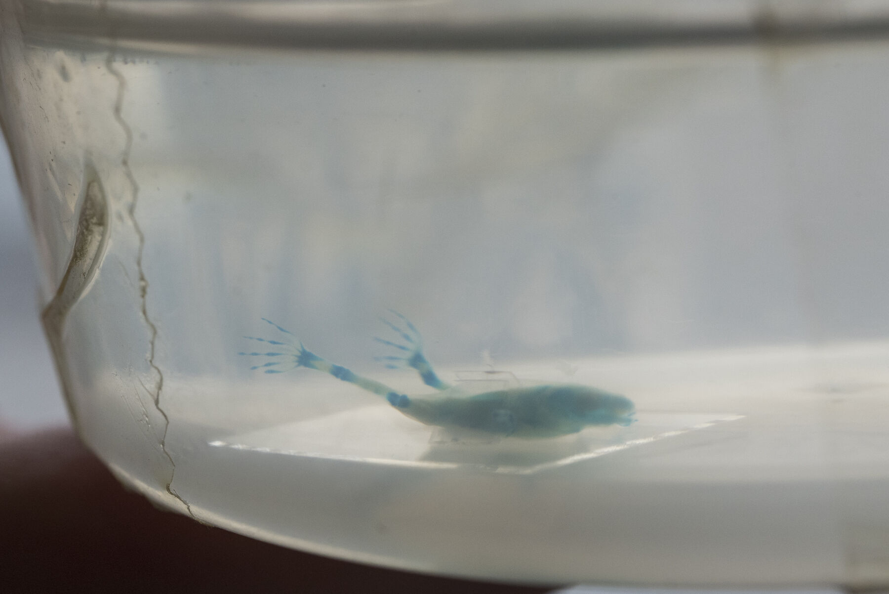 Figure 6.5In contrast, artist Brandon Ballengée has found a way to both carry out bio-artistic research and preserve material outcomes that can be collected. In Species Reclamation via a Non-linear Genetic Timeline (1998–2006, fig. 6.6, fig. 6.7) he aims at phenotypically re-creating an extinct aquatic frog species using closely related extant species by resurfacing historically described physical traits, resulting in “living sculptures” (). They live their natural life span before being cleared and stained (a chemical process to reveal the animal’s skeletal anatomy consisting of bones and cartilage), photographed, and sold as prints or as conserved specimens, ready to be released into glycerin, where their translucent members seem to gracefully swim.